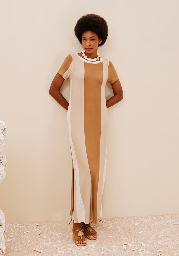 Este vestido longo da marca Cacay é a escolha perfeita para quem busca conforto sem abrir mão do estilo. Feito de malha, oferece um ajuste suave e confortável ao corpo. Seu design de manga curta e a fenda lateral adicionam um toque moderno e sensual, enquanto as diferentes tonalidades de bege criam um efeito de gradiente sofisticado, que valoriza a silhueta. Ideal para ocasiões casuais ou mais elegantes, esse vestido é uma peça versátil que combina perfeitamente com diferentes acessórios e estilos. |